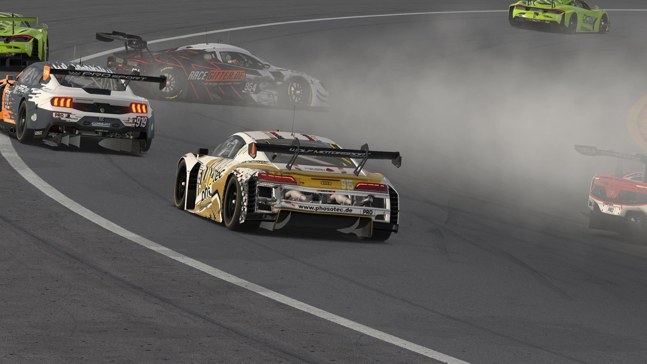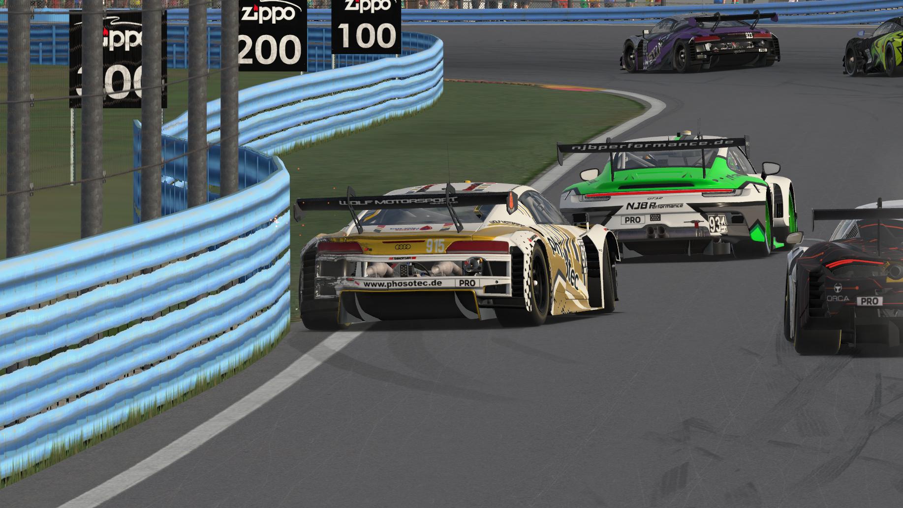 Durch einen Unfall vor uns, mit Ausweichen in die Leitplanke und entsprechendem Schaden, hatte ich keine Möglichkeit mehr, wieder nach vorne zu fahren. Nach Pitstop mit Fast-Repair konnte Merlin dann wieder angreifen und aufholen. Den letzten Stint ging Luke an, musste nach einem Dreher mit unglücklichem Rejoin das Rennen leider vorzeitig beenden.
